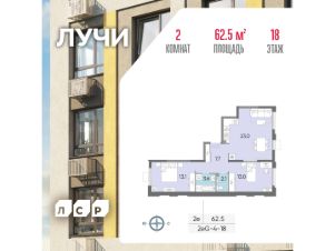 Продается 2-комнатная квартира общей площадью 62.5 кв. метров на 18 этаже жилого комплекса Лучи.