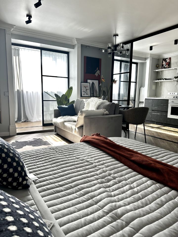 Гостиная: Раскладной диван для гостей + роскошная кровать 180x200 с подъемным механизмом.