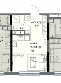 Планировка: функциональная студия без отделки, можно реализовать индивидуальный дизайн-проект под свой стиль.