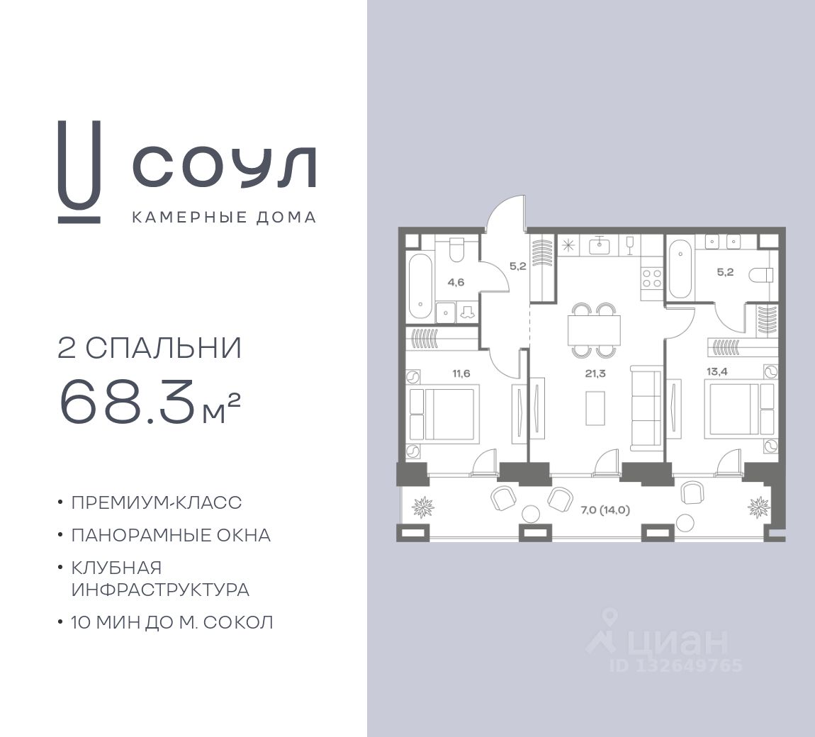 Продается 2-к. квартира номер 183 общей площадью 68.3 кв.м. на 3-м этаже 7 этажного дома, камерные дома СОУЛ (премиум-класс). Без отделки.