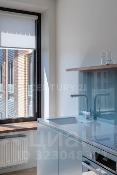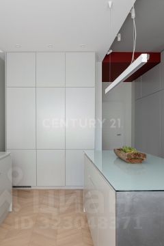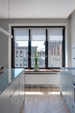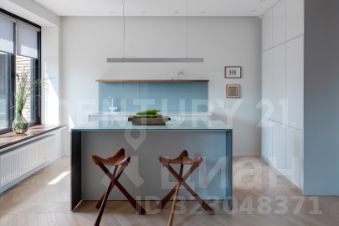 В отделке использовались только качественные, брендовые материалы (полы-паркет, итальянская плитка, бытовая техника Bosch, смеситель Blanco). Корпусная мебель и подоконник изготовлены на заказ по эскизам дизайнера. Несколько сценарием освещения. Рабочая поверхность и кухонный остров имеют одинаковые размеры и расположены друг напротив друга. В нижней части гарнитура находятся встроенные посудомоечная машина, варочная поверхность, духовой шкаф, вытяжка интегрированна в потолок. Полноразмерный холодильник и стиральная машина размещены в высоких пеналах. В острове предусмотрены выдвижные ящики, за остальными фасадами полки.