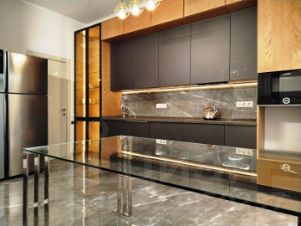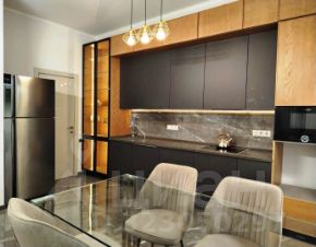 Кухня-гостиная оснащена варочной панелью, встроенной СВЧ, посудомоечной машиной BOSCH, люксовым холодильником HITACHI, в центре помещения расположилась шикарная обеденная зона;