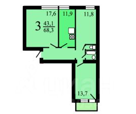 Общая площадь квартиры составляет 65,9м2, Кухня 10,6м2, комнаты раздельные 14,4м2 и 11,5м2, 17,9м2, ванна и туалет раздельные, длинный коридор, высота потолков 2.7м.