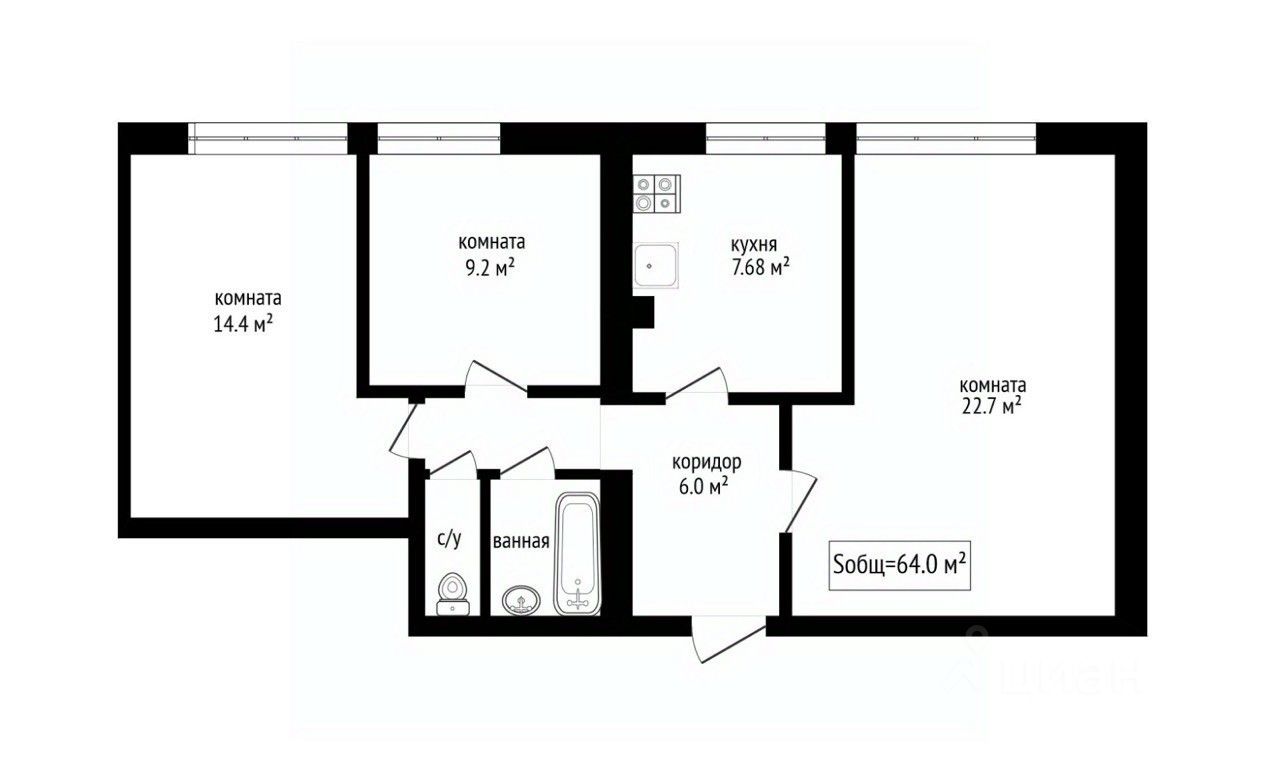 • Планировка: Линейная, изолированные комнаты. Кухня в центре.