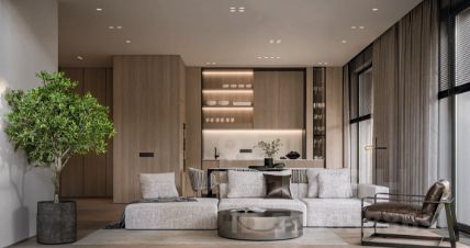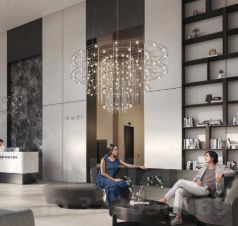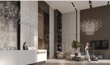 4. Стильные графичные интерьеры ультрасовременного лобби, полотки 5 м, дизайнерская мебель, модные светильники, стойки ресепшен с консьержами.