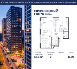 Продаётся просторная 2-комнатная квартира общей площадью 58.4 м² на 11 этаже в новом жилом комплексе "Сиреневый парк", расположенном в Восточном административном округе Москвы на улице Тагильская. Всего 10 минут ходьбы от станции метро "Бульвар Рокоссовского" и одноимённой платформы МЦК.