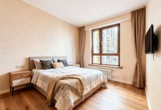 Планировка включает кухню 20 квм, гостиную 18 квм, 2 изолированные спальни, гардеробную, санузел. Утепленный балкон с французскими окнами в пол можно использовать как веранду.