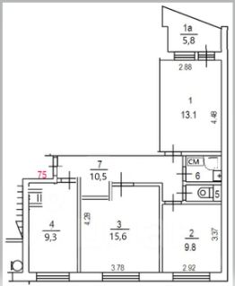 Площадь квартиры: 60,8 м2+лоджия 5,8 м2.