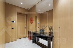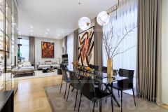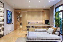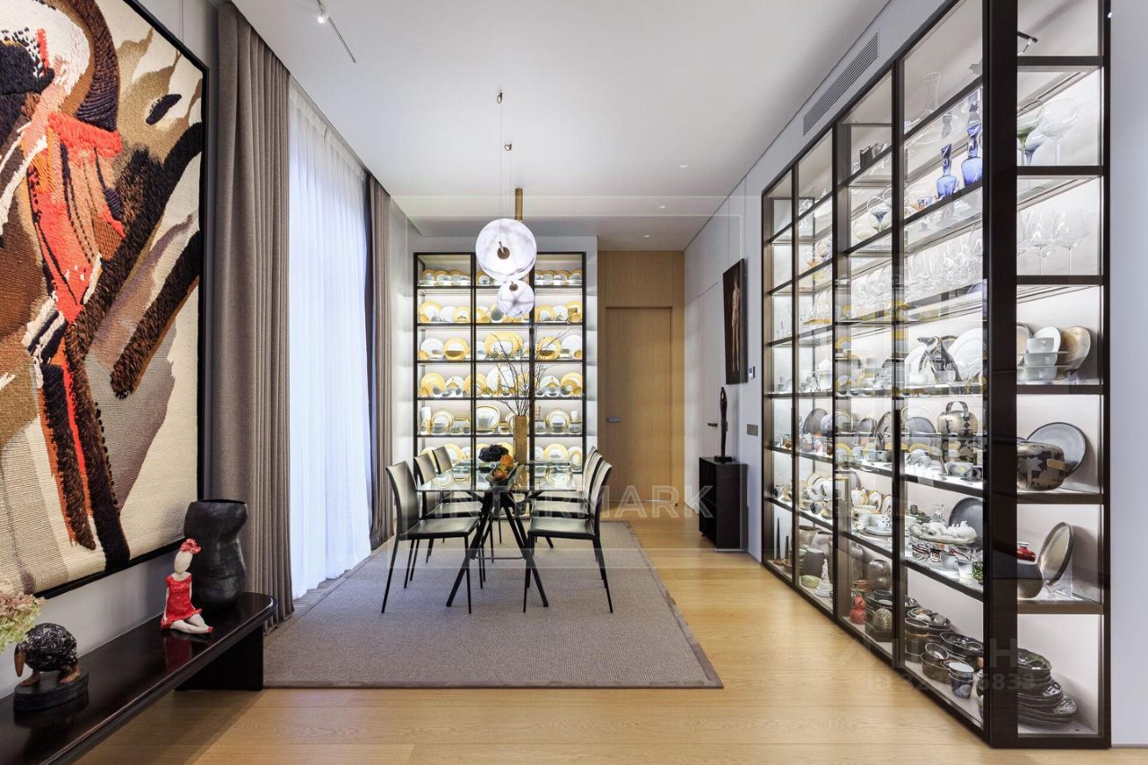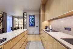 Каждая деталь интерьера подобрана с особым чувством стиля: теплая палитра отделки и панорамное остекление наполняют квартиру естественным светом и уютом. Пространство украшает итальянская мебель от ведущих фабрик, таких как Flexform, Minotti, Zanotta, Maxalto и Gallotti Radice, а также функциональные витрины Olivieri и дизайнерские светильники Henge. Кухня укомплектована легендарной бытовой техникой Miele, Liebherr.