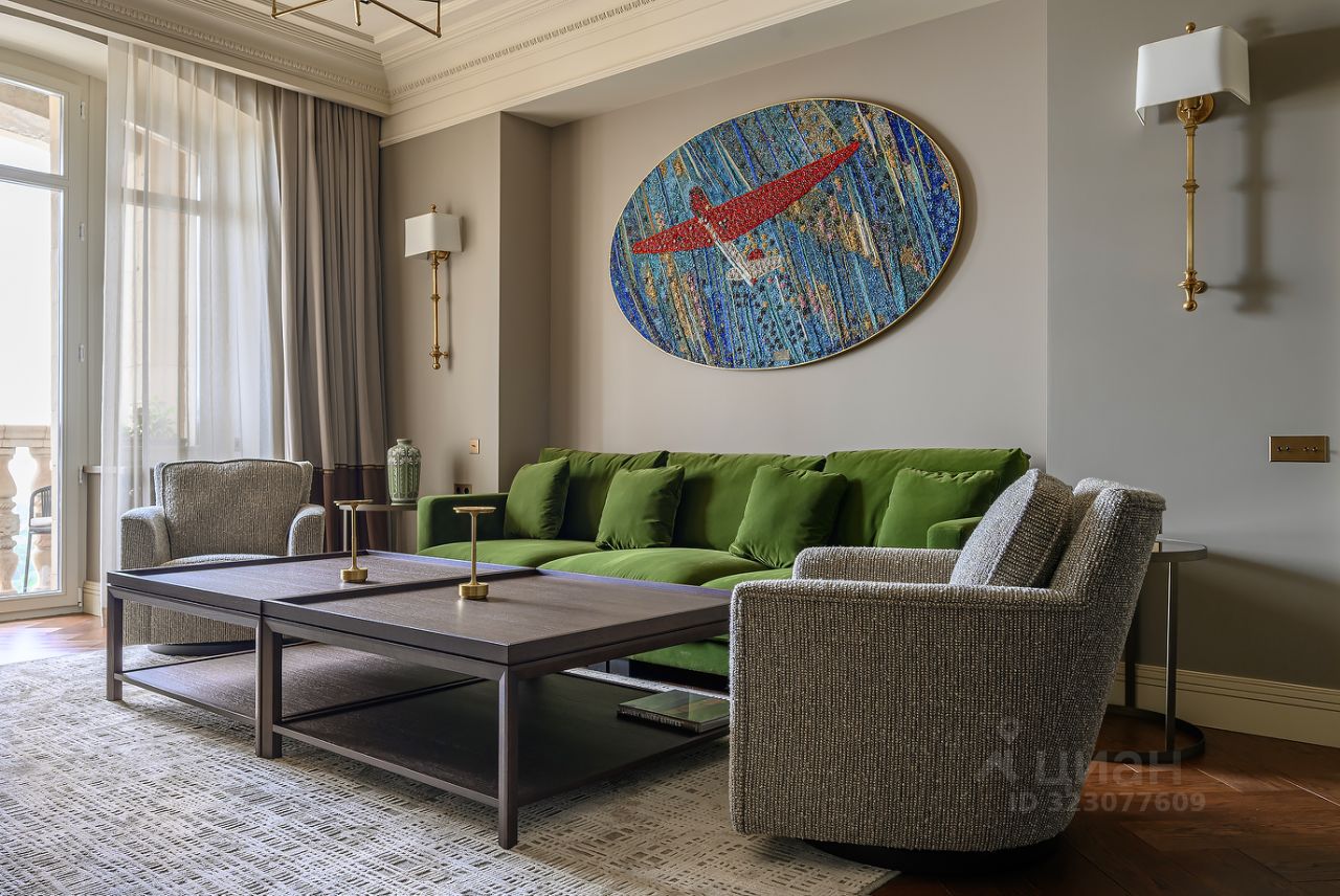 Квартира выполнена в безупречном стиле, подчеркивающем величие сталинской эпохи. В отделке использованы только премиальные материалы: