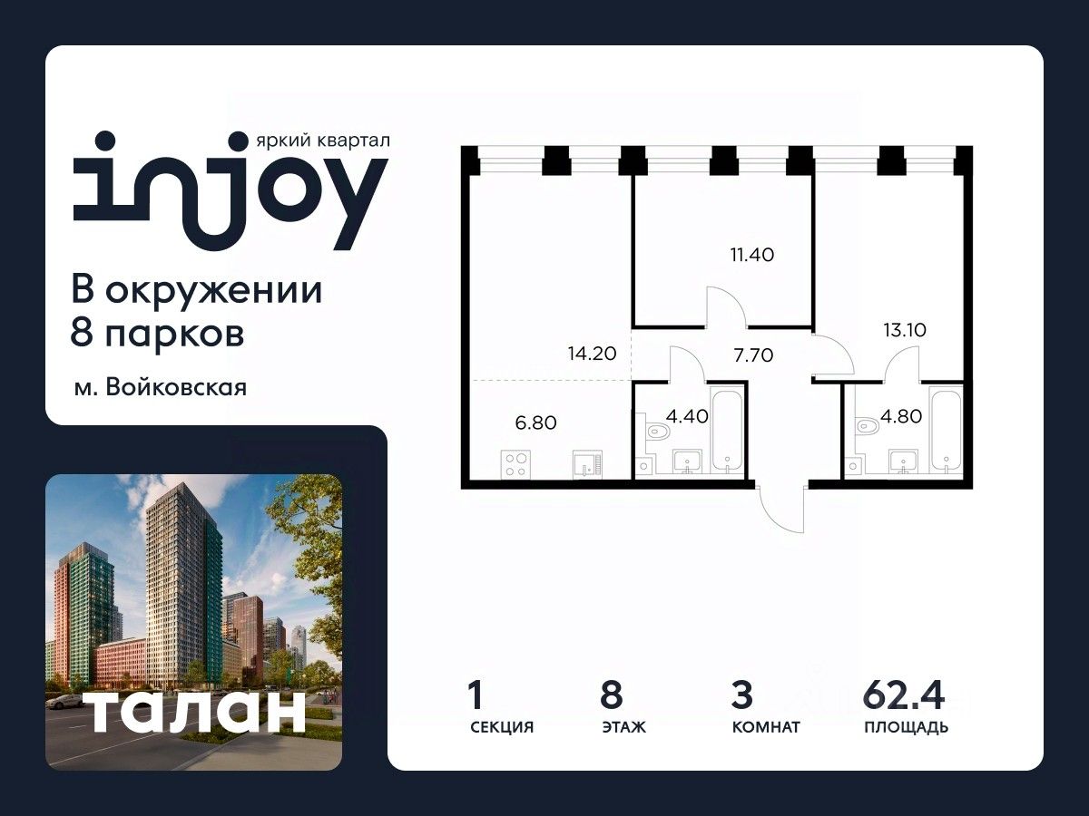 Прямая продажа от застройщика. В жилом квартале, расположенном в Войковском районе Москвы, продаётся 3-комнатная квартира площадью 62.4 кв.м без отделки. Квартира расположена на 8 этаже 35-этажного дома, корпус 1, в жилом квартале бизнес-класса INJOY.