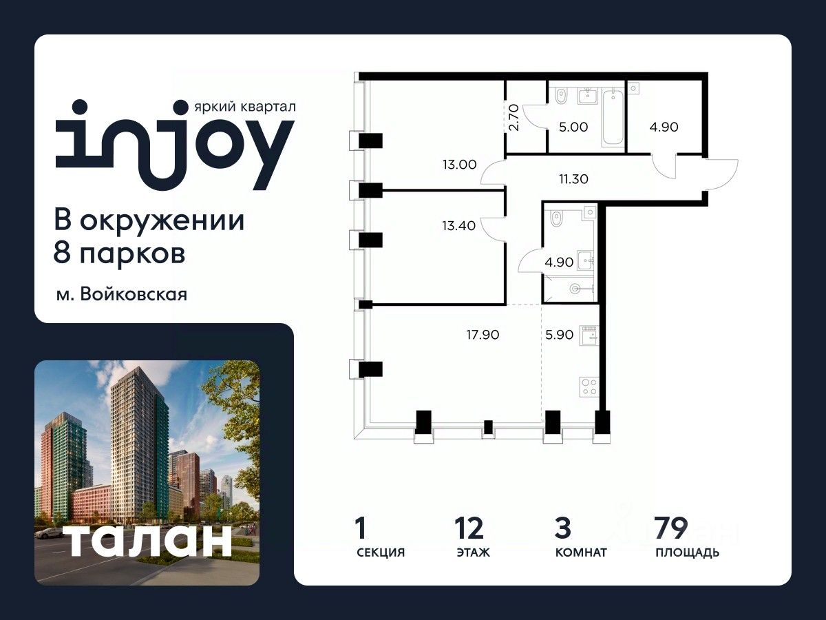 Прямая продажа от застройщика. В жилом квартале, расположенном в Войковском районе Москвы, продаётся 3-комнатная квартира площадью 79 кв.м без отделки. Квартира расположена на 12 этаже 35-этажного дома, корпус 1, в жилом квартале бизнес-класса INJOY.