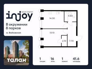 Прямая продажа от застройщика. В жилом квартале, расположенном в Войковском районе Москвы, продаётся 1-комнатная квартира площадью 41.6 кв.м без отделки. Квартира расположена на 16 этаже 35-этажного дома, корпус 1, в жилом квартале бизнес-класса INJOY.