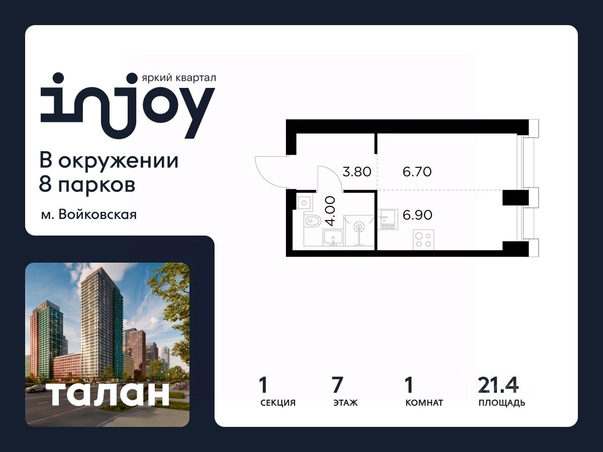 Прямая продажа от застройщика. В жилом квартале, расположенном в Войковском районе Москвы, продаётся 1-комнатная квартира площадью 21.4 кв.м без отделки. Квартира расположена на 7 этаже 35-этажного дома, корпус 1, в жилом квартале бизнес-класса INJOY.