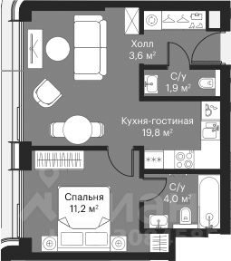 Квартира площадью 40,5 м2 с отделкой Whitebox, с изолированной спальней и комфортной кухней-гостиной и 2 санузлами, высота потолков 3 метра и панорамное остекление в пол.