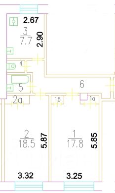 Кухня размером 7,7 кв.м., изолированные комнаты 18,5 кв.м. и 17,8 кв.м., раздельный санузел и большой коридор со встроенными шкафами.