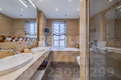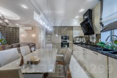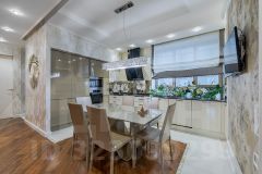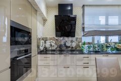 Зона кухни оборудована столешницей из натурального камня, встроенной мойкой, а также встроенной техникой Miele, Asko.
