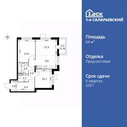 Продаётся 3-к квартира номер 142 общей площадью 64.8 кв.м. на 14-м этаже 25 этажного здания. Отделка Whitebox. Цена с учётом скидки.