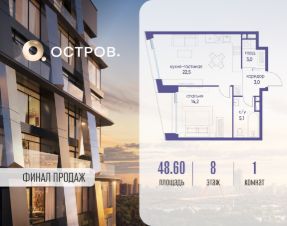 Продаётся однокомнатная квартира от застройщика: общая площадь 48.60 м², жилая 14.20 м², кухня 22.50 м², 8, жилой квартал "Остров 12", корпус 1 (12.1 квартал) (секция 2). срок сдачи: 4-кв. 2025.