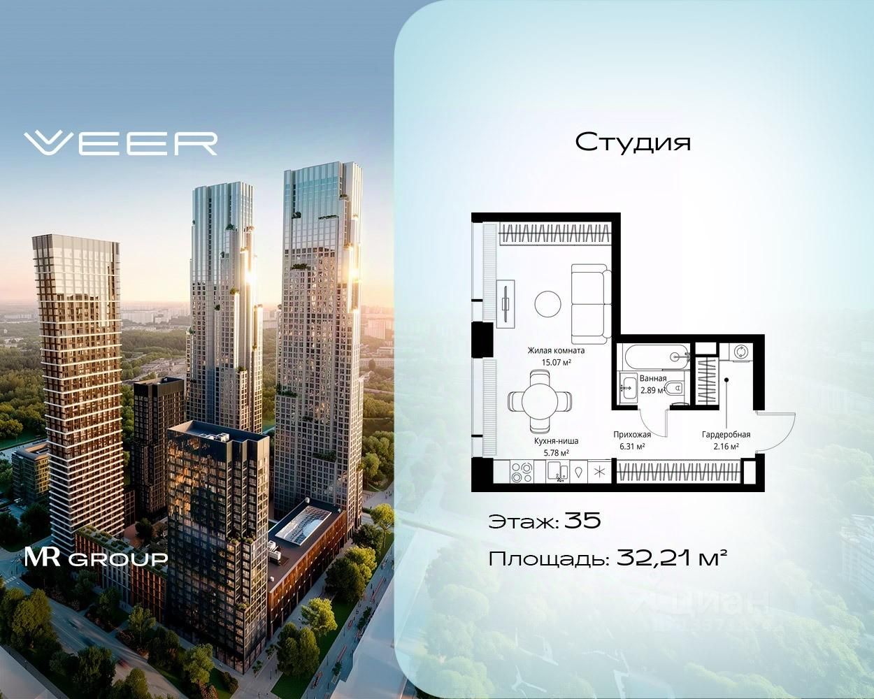 Продаётся студия общей площадью 32.21 м² без отделки в ЖК VEER на 35-м этаже 38 этажного дома.