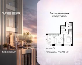 Продаётся 1-комнатная квартира общей площадью 49.16 м² без отделки в ЖК VEER на 5-м этаже 38 этажного дома.