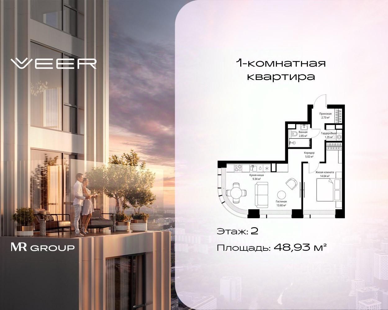 Продаётся 1-комнатная квартира общей площадью 48.93 м² без отделки в ЖК VEER на 2-м этаже 38 этажного дома.