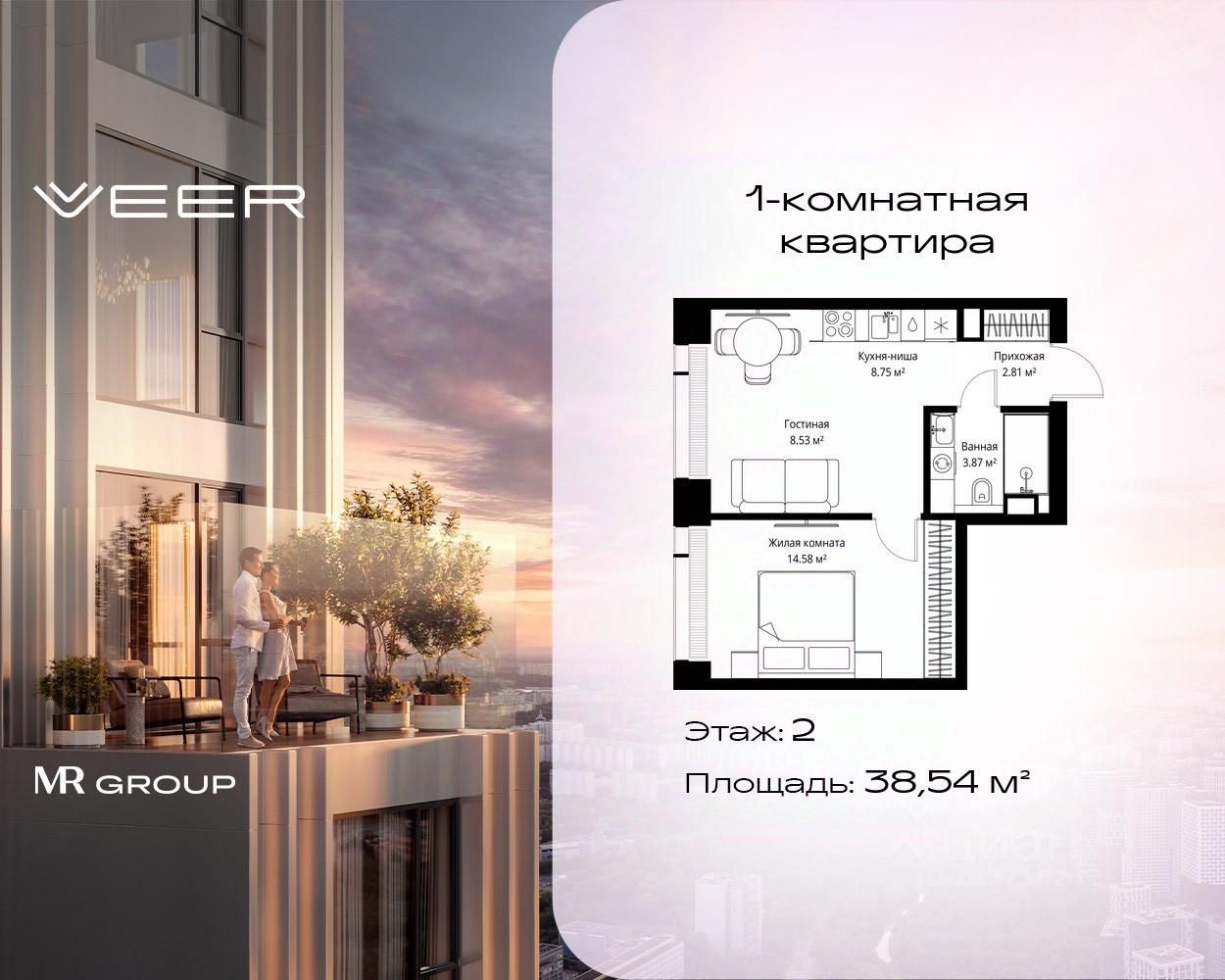 Продаётся 1-комнатная квартира общей площадью 38.54 м² без отделки в ЖК VEER на 2-м этаже 38 этажного дома.