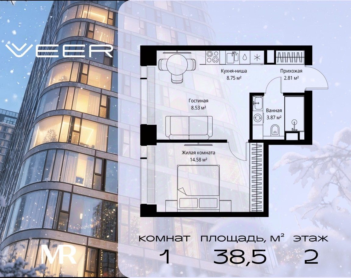 Продаётся 1-комнатная квартира общей площадью 38.54 м² без отделки в ЖК Веер на 2-м этаже 38 этажного дома.