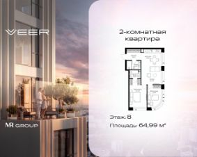 Продаётся 2-комнатная квартира общей площадью 64.99 м² без отделки в ЖК VEER на 8-м этаже 38 этажного дома.