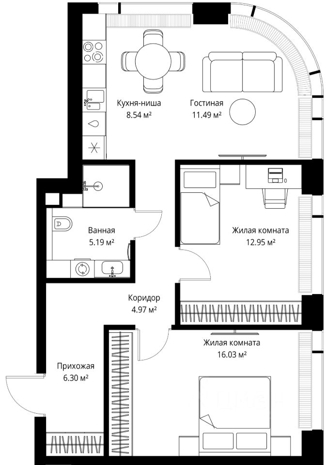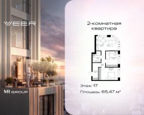 Продаётся 2-комнатная квартира общей площадью 65.47 м² без отделки в ЖК VEER на 17-м этаже 38 этажного дома.