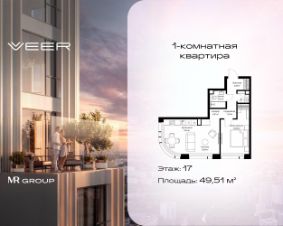 Продаётся 1-комнатная квартира общей площадью 49.51 м² без отделки в ЖК VEER на 17-м этаже 38 этажного дома.