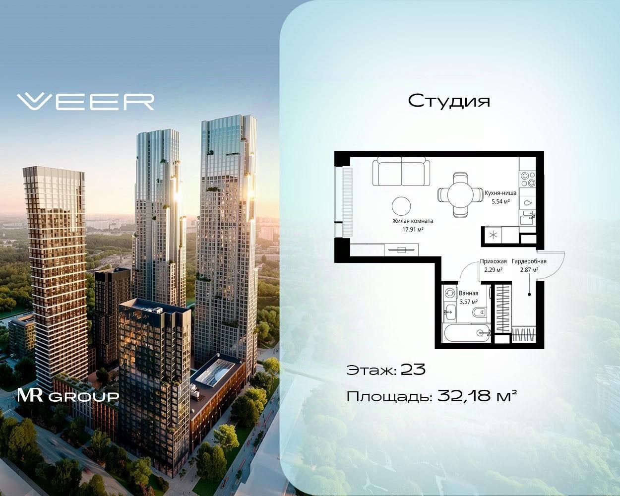 Продаётся студия общей площадью 32.18 м² без отделки в ЖК VEER на 23-м этаже 38 этажного дома.
