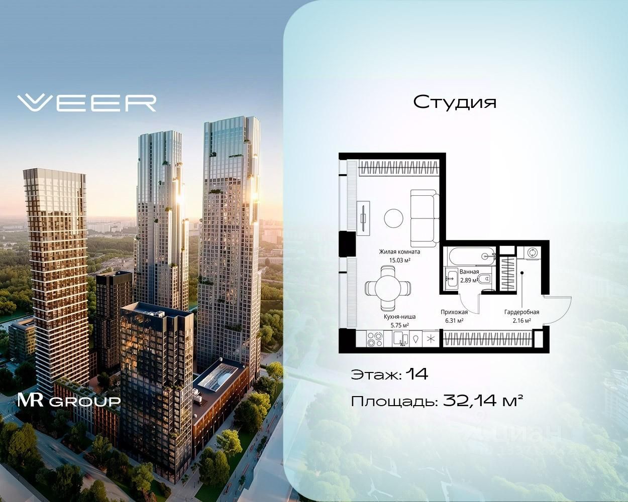 Продаётся студия общей площадью 32.14 м² без отделки в ЖК VEER на 14-м этаже 38 этажного дома.