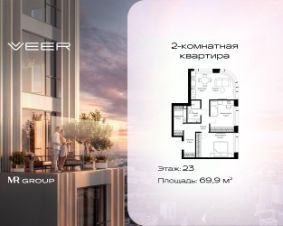 Продаётся 2-комнатная квартира общей площадью 69.90 м² без отделки в ЖК VEER на 23-м этаже 38 этажного дома.