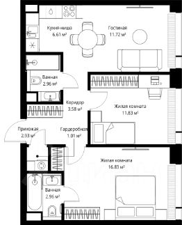 Продаётся 2-комнатная квартира общей площадью 60.43 м² без отделки в ЖК VEER на 26-м этаже 38 этажного дома.