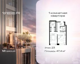 Продаётся 1-комнатная квартира общей площадью 47.40 м² без отделки в ЖК VEER на 23-м этаже 38 этажного дома.