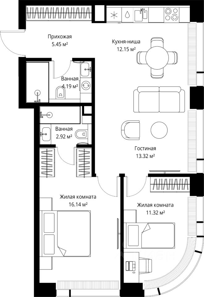 Продаётся 2-комнатная квартира общей площадью 65.49 м² без отделки в ЖК VEER на 26-м этаже 38 этажного дома.