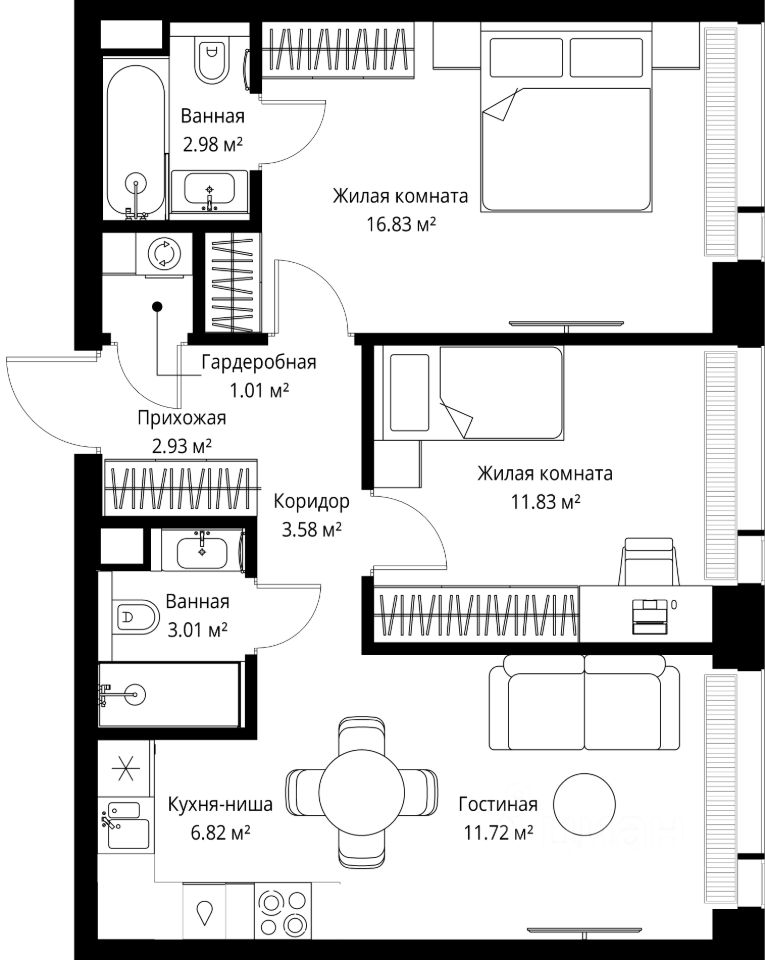 Продаётся 2-комнатная квартира общей площадью 60.71 м² без отделки в ЖК VEER на 32-м этаже 38 этажного дома.
