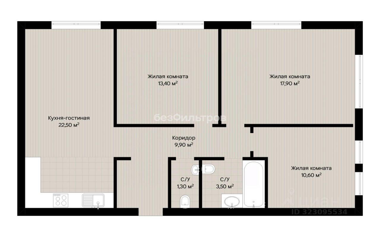 Квартира расположена по адресу: Новохохловская улица, 15к1. Общая площадь составляет 79,1 м², жилая площадь — 41,9 м², а просторная кухня-гостинная занимает 22,5 м². Все комнаты изолированные, в квартире два санузла. Она находится на 5 этаже 33-этажного монолитного дома, построенного в 2022 году. Высота потолков — 2,63 м. Состояние квартиры -отличное, выполнена отделка от застройщика.