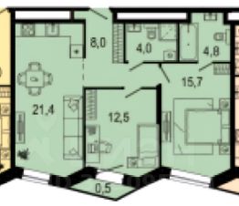 с выxoдом нa бaлкон, две спальни 15.7 и 12.5 кв.м.,