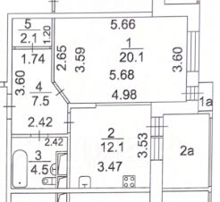 Планировкой предусмотрено: комната 20 м2, кухня 12 м2, совмещённый санузел 5 м2, гардеробная, просторный квадратный коридор и большая лоджия. Выход на лоджию с кухни. Из комнаты есть выход на французский балкончик.