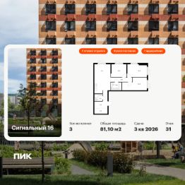Продаётся 3-комн. квартира площадью 81,1 кв.м на 31 этаже 33 этажного дома (Корпус 2.1.1, Секция 1) проекта ПИК Сигнальный 16. Светлый просторный подъезд на уровне земли, функциональная планировка, большие окна, c отделкой.