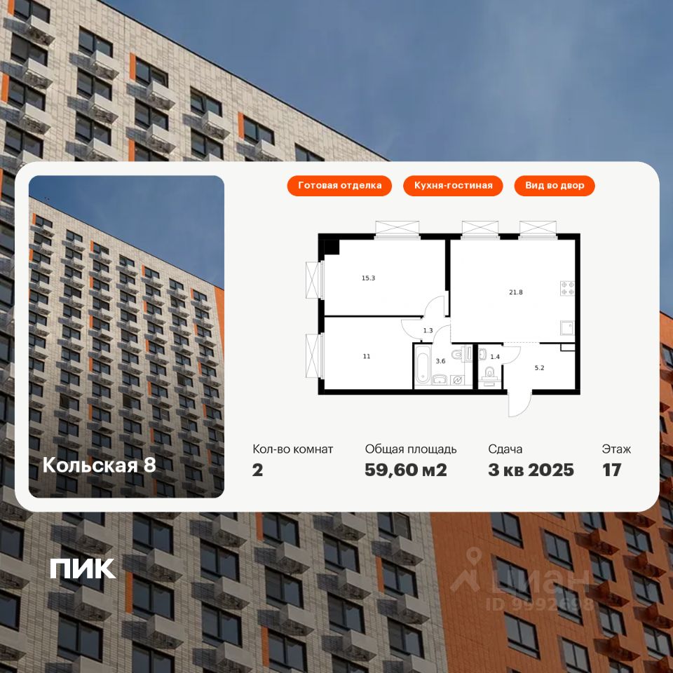 Продаётся 2-комн. квартира площадью 59,6 кв.м на 17 этаже 33 этажного дома (Корпус 2.4, Секция 1) проекта ПИК Кольская 8. Светлый просторный подъезд на уровне земли, функциональная планировка, большие окна, c отделкой.