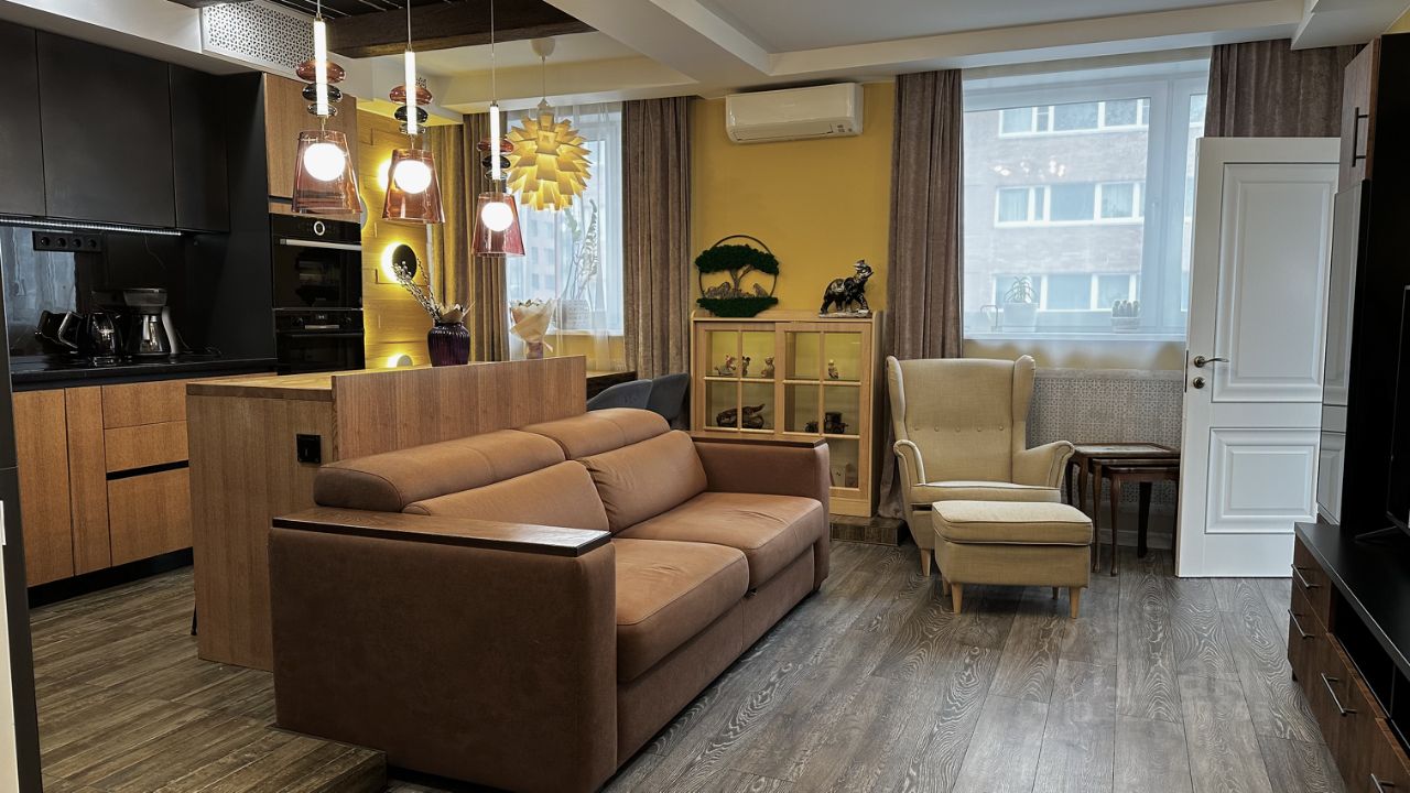 Две светлые изолированные комнаты, большая просторная кухня-гостиная с уютным электрокамином, оборудованная самой современной бытовой техникой: двухдверный холодильник, датчики протечки, фильтры с обратным осмосом, измельчитель пищевых отходов (это всё остается будущему владельцу).