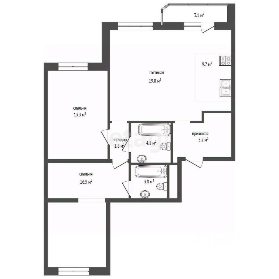 - к ней примыкает детский совмещенный санузел с полноценной ванной - 3,2 кв. м,