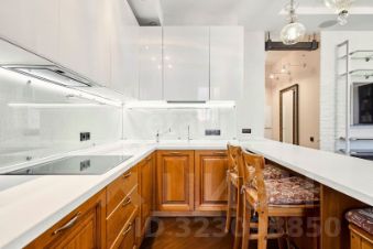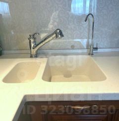 На кухне встроенный 2-х камерный холодильник Liebherr, микроволновка, духовка, варочная панель и стиральная машина Hansa, посудомоечная машина Bosch. Столешница из акрилового камня с мойкой (2 чаши), фильтр для питьевой воды "Аквафор".