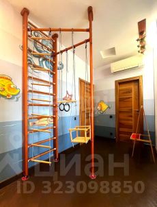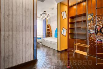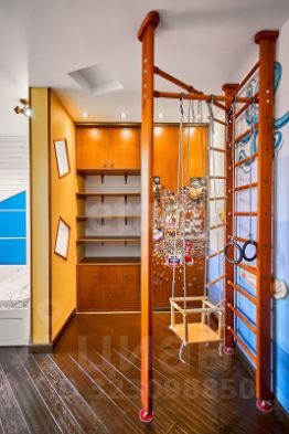В детской, оформленной в морской теме, рабочая зона (стол и стул), "растущая" вместе с ребенком (может быть использована от 4 до 16 лет) и спортивный комплекс с качелями.
