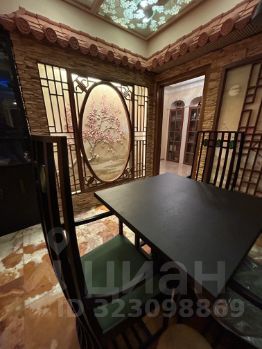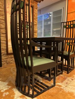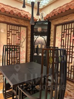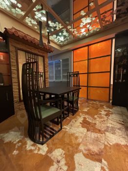 Столовая выполнена в японском стиле. Черепица, картины инкрустированные натуральным камнем, решётки кумико, - всё это ручная работа, по индивидуальному заказу.