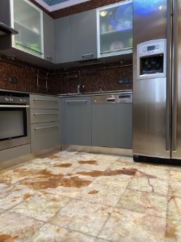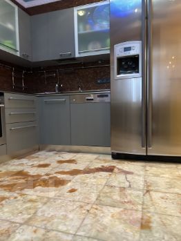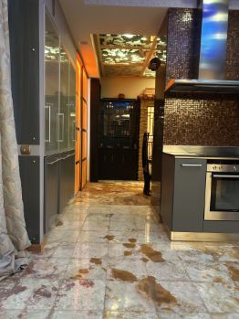 Кухня - Германия, полностью укомплектована посудой и техникой. Стеклянный мозаичный фартук. Светильник на потолке - витражный купол в форме эллипса - индивидуальный заказ. Пол - оникс Иран.