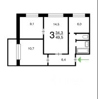Общая площадь 49,5 м². Жилая 34,3 м² (комнаты 14,5 м², 10,7 м² и 9,1 м²).